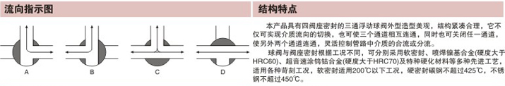 三通球閥可分為L形和T形,L形(Q44F)三通球閥用於介質流向的(de)切換,能(néng)使相互垂直(zhí)的兩個通道連接;T形(Q45F)三通球閥用於介質分流、合流及流向切換。T形三(sān)通可以使三個通道相互連通或使其中的(de)兩個通道連通。三(sān)通球閥一(yī)般(bān)采用兩閥座結構,亦可根據用戶要求采用四閥座結構。